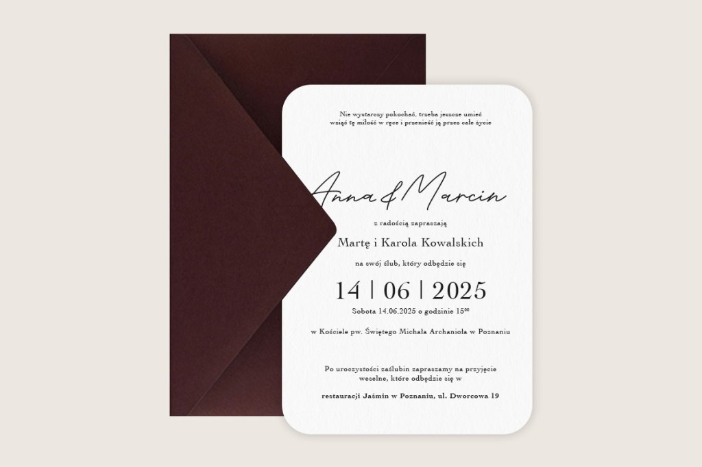 Zaproszenia z zaokrąglonymi tylko z jednej strony to subtelny sposób na wprowadzenie elementu nowoczesności. Zaokrąglony jeden bok dodaje oryginalności i sprawia, że zaproszenie wyróżnia się na tle innych. Tego typu zaproszenia mogą być minimalistyczne, z delikatnymi zdobieniami, lub bardziej wyraziste, w zależności od stylu Waszego ślubu.