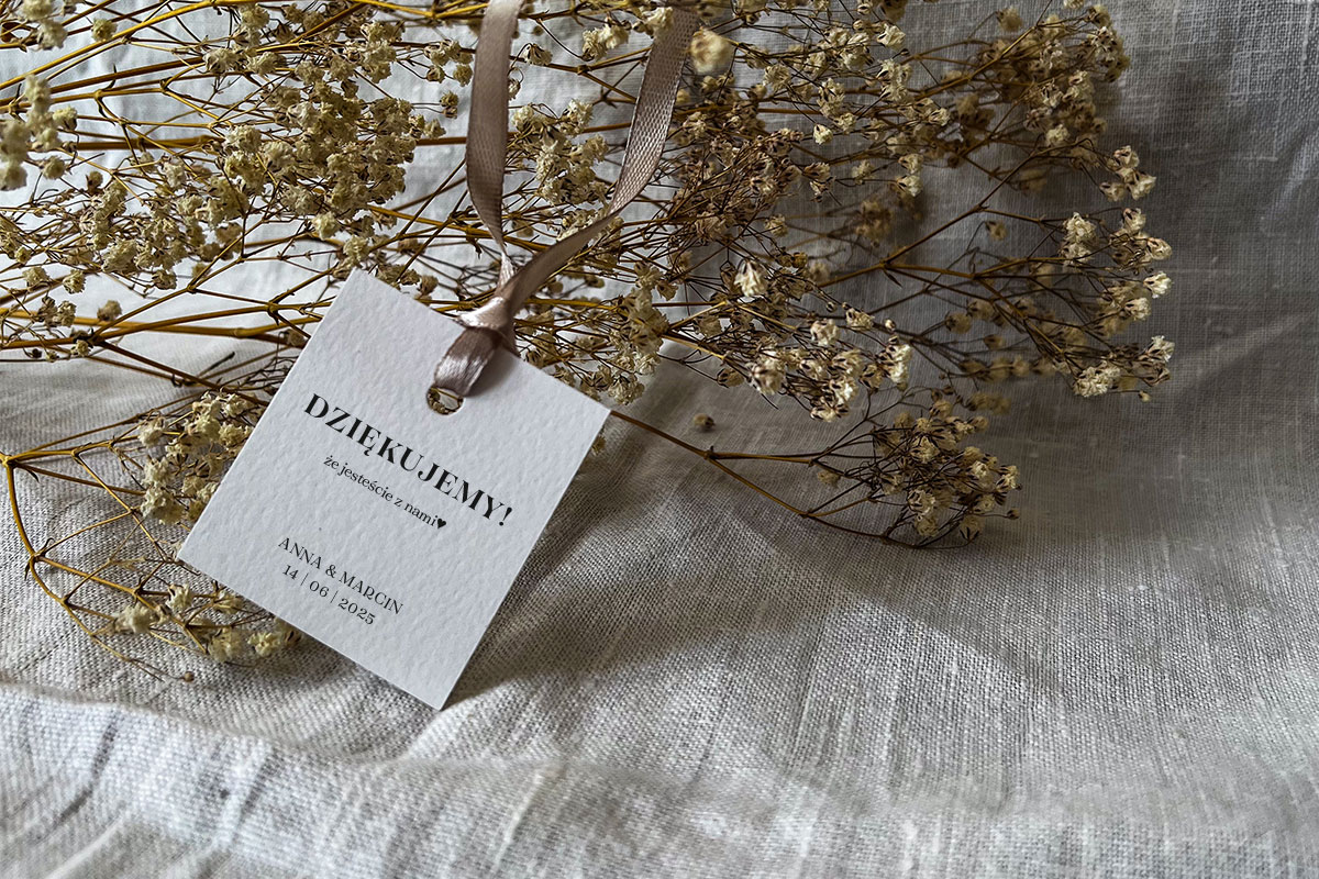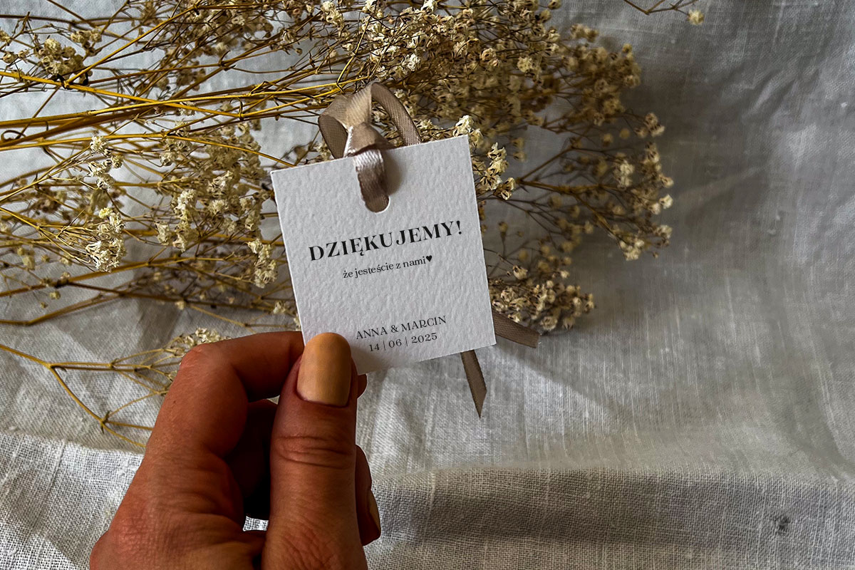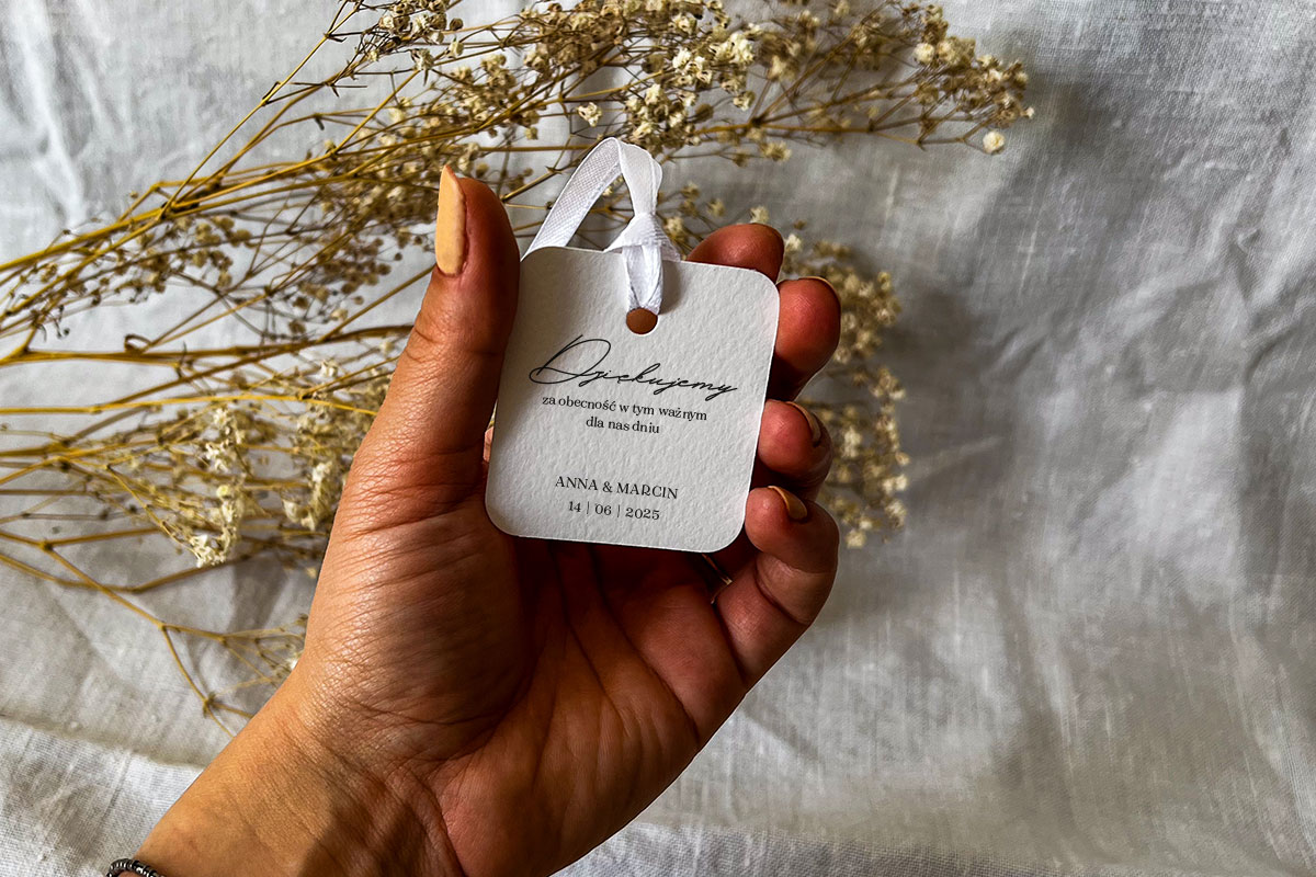 Prostokątne karteczki do prezentów dla gości o wymiarach 5.5 cm x 5 cm z otworem + wstążka 6 mm (możliwość wymiany wstążki na taką o szerokości 12 mm, wstążka wliczona w cenę, inne kolory wstążek: https://slubneprojekty.pl/kolory-wstazek/). Wzór graficzny omawiany jest indywidualnie (dopasowany do potrzeb klienta). Wydruk na wysokiej jakości papierze (250 g). Możliwa zmiana koloru papeterii w ramach dostępnych kolorów papieru: https://slubneprojekty.pl/kolory-papieru/.