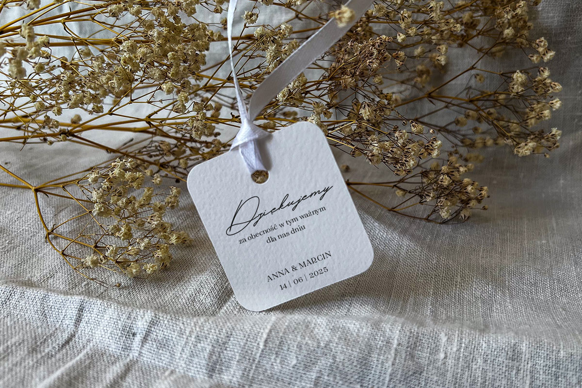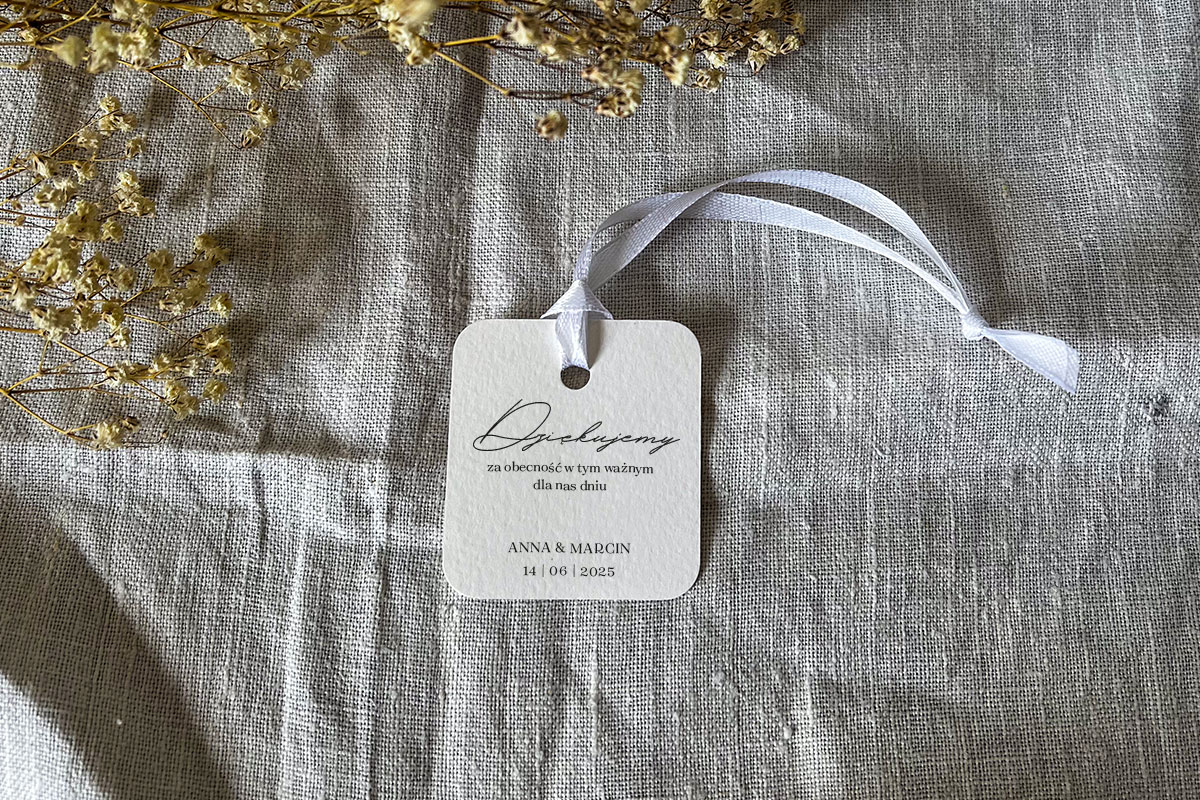 Karteczka do prezentów dla gości o zaokrąglonych rogach w wymiarach 5.5 cm x 5 cm z otworem + wstążka 6 mm (możliwość wymiany wstążki na taką o szerokości 12 mm, wstążka wliczona w cenę, inne kolory wstążek: https://slubneprojekty.pl/kolory-wstazek/). Wzór graficzny omawiany jest indywidualnie (dopasowany do potrzeb klienta). Wydruk na wysokiej jakości papierze (250 g). Możliwa zmiana koloru papeterii w ramach dostępnych kolorów papieru: https://slubneprojekty.pl/kolory-papieru/.