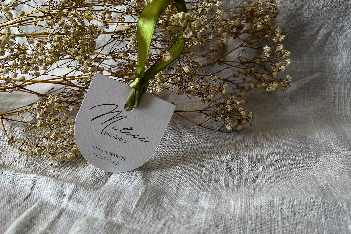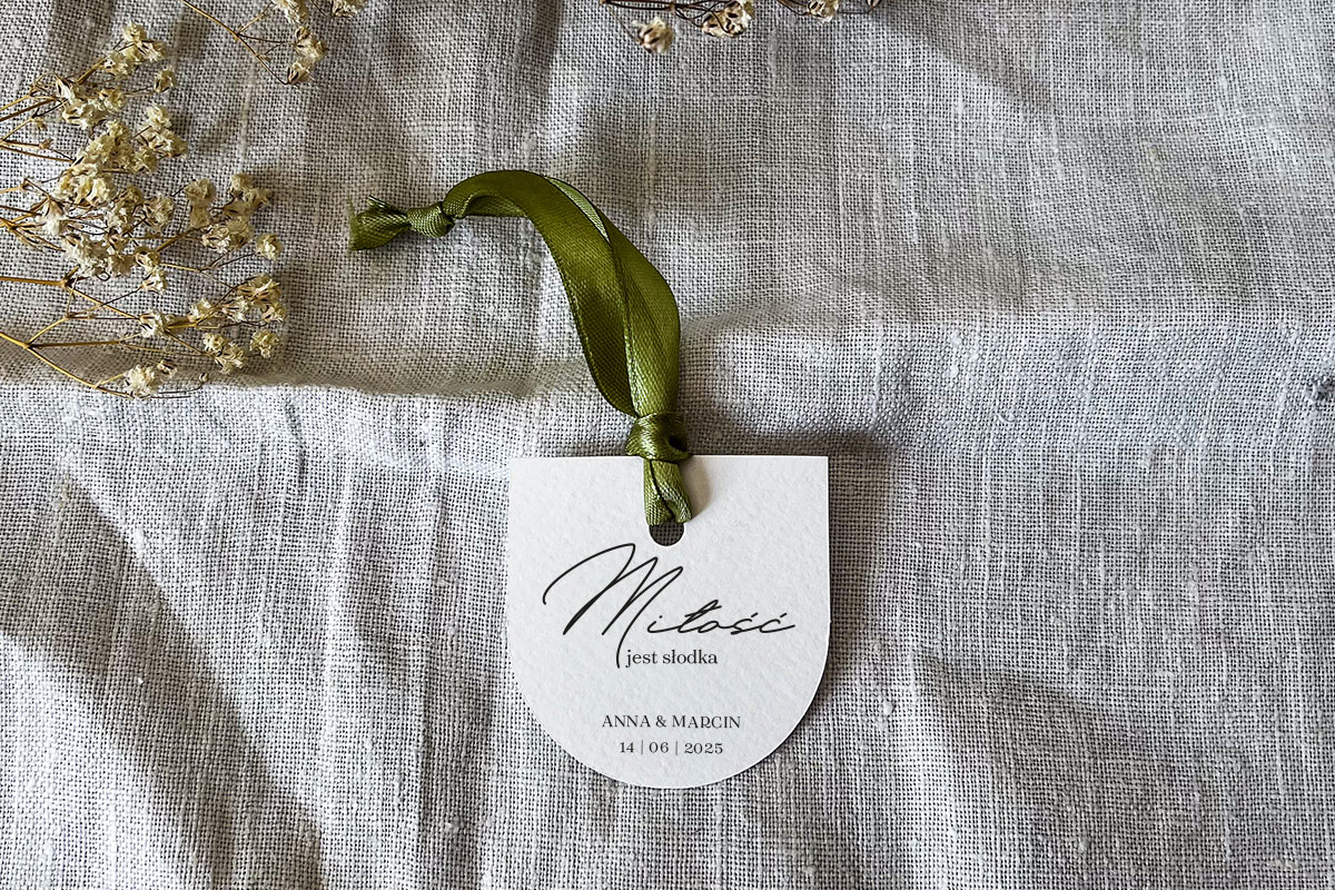 Karteczka do prezentów dla gości jednostronnie zaokrąglona o wymiarach 5.5 cm x 5 cm z otworem + wstążka 12 mm (możliwość wymiany wstążki na taką o szerokości 6 mm, wstążka wliczona w cenę, inne kolory wstążek: https://slubneprojekty.pl/kolory-wstazek/). Wzór graficzny omawiany jest indywidualnie (dopasowany do potrzeb klienta). Wydruk na wysokiej jakości papierze (250 g). Możliwa zmiana koloru papeterii w ramach dostępnych kolorów papieru: https://slubneprojekty.pl/kolory-papieru/.