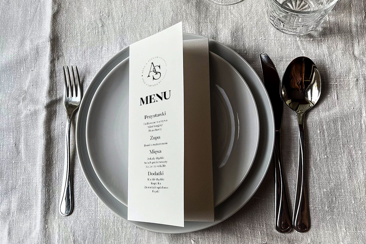 Menu na talerz o wymiarach ok. 10 cm x 21 cm. Cena obejmuje personalizację pod wybrany projekt zaproszeń. Wzór graficzny omawiany jest indywidualnie (dopasowany do potrzeb klienta). Możliwa zmiana kolorystyczna papeterii, kolory papieru (fakturowany 250g) dostępne pod linkiem: https://slubneprojekty.pl/kolory-papieru/