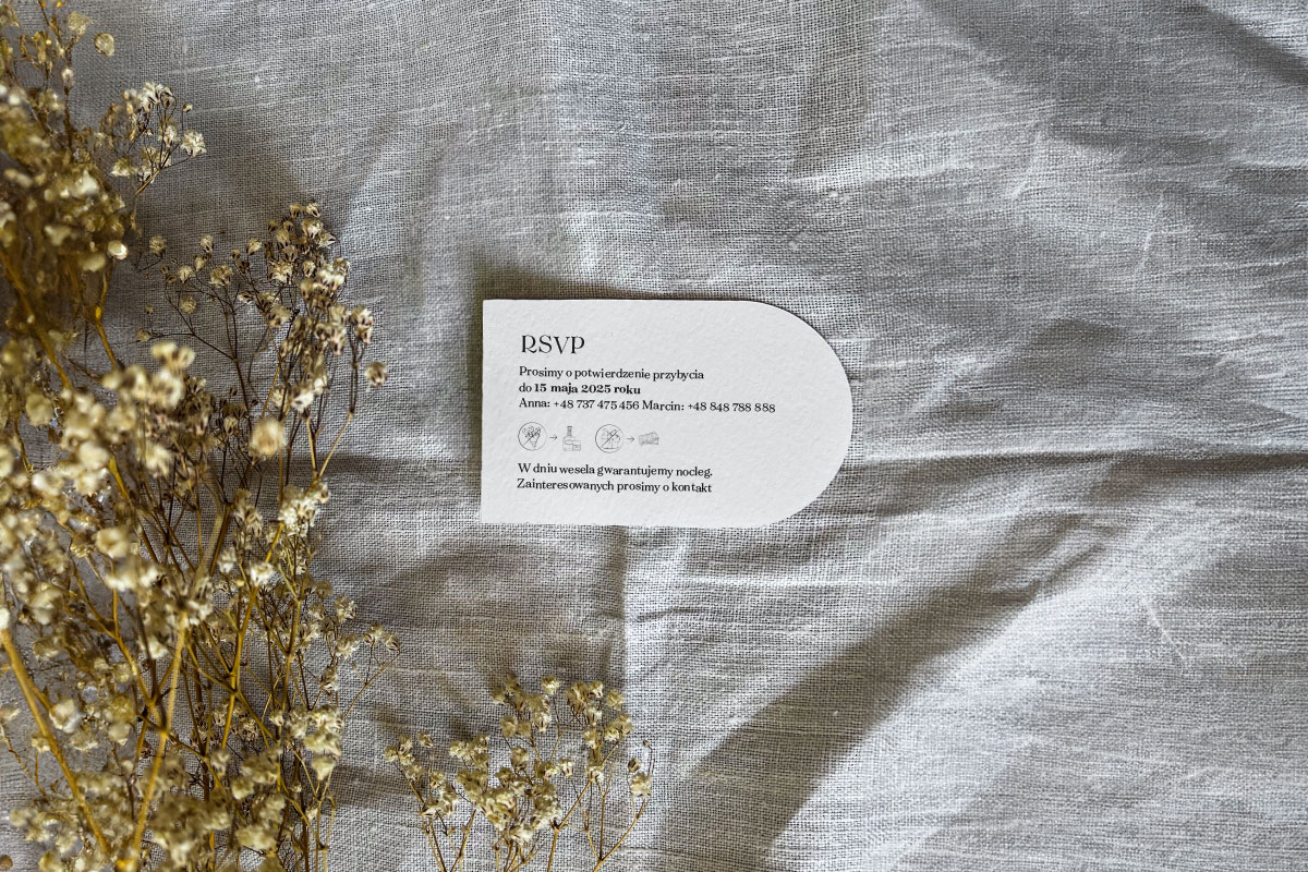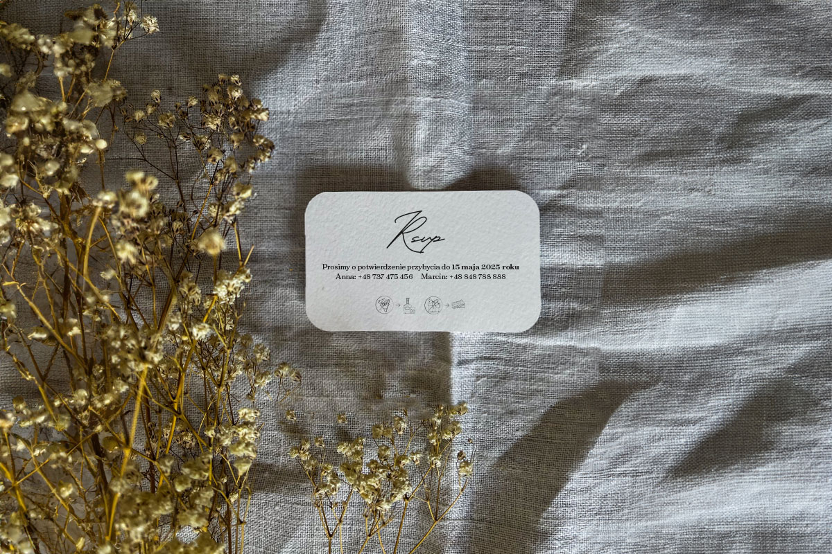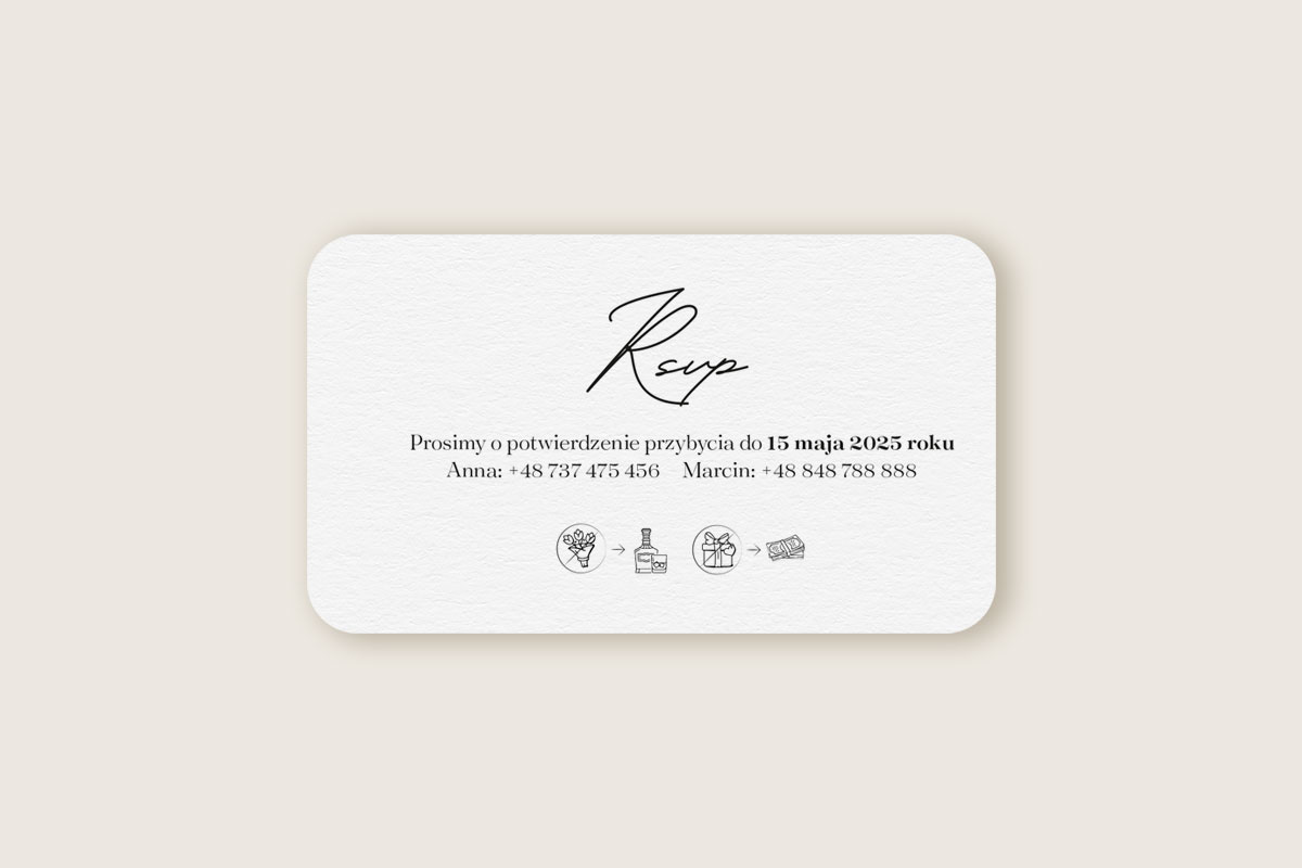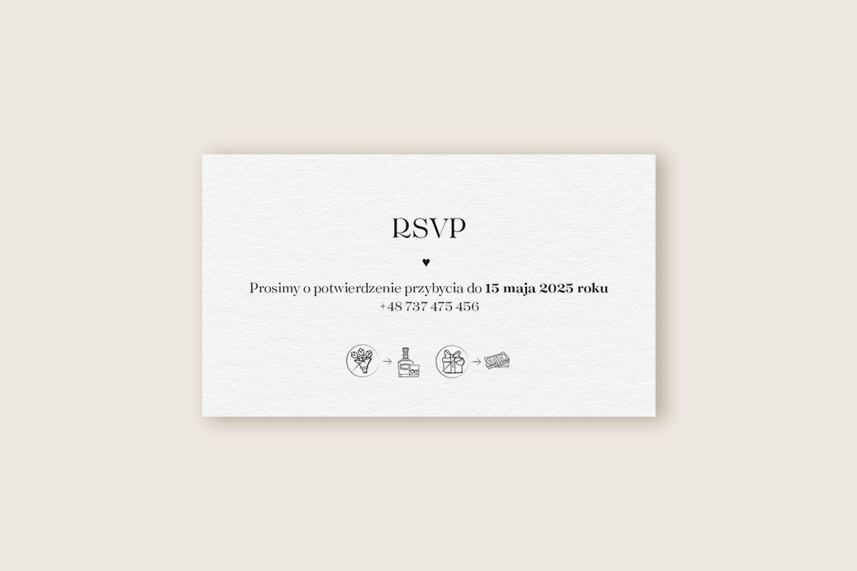 RSVP + rebus – potwierdź udział w uroczystości, zaznacz jaki chcesz prezent | Karteczki RSVP to idealny sposób na sprawne zarządzanie listą gości. Drukowane na wyjątkowym papierze fakturowanym, dołączane do zaproszeń, zapewniają elegancki wygląd. Każda karteczka została starannie zaprojektowana, aby ułatwić gościom potwierdzenie swojego udziału w wyjątkowym dniu. Dzięki nim organizacja Twojego ślubu będzie jeszcze łatwiejsza i bardziej precyzyjna. Oferujemy różnorodne wzory i kolory, które z łatwością dopasujesz do stylu swojej uroczystości. Wybierz karteczki RSVP, które spełnią Twoje oczekiwania i sprawią, że Twój dzień będzie jeszcze bardziej niezapomniany!