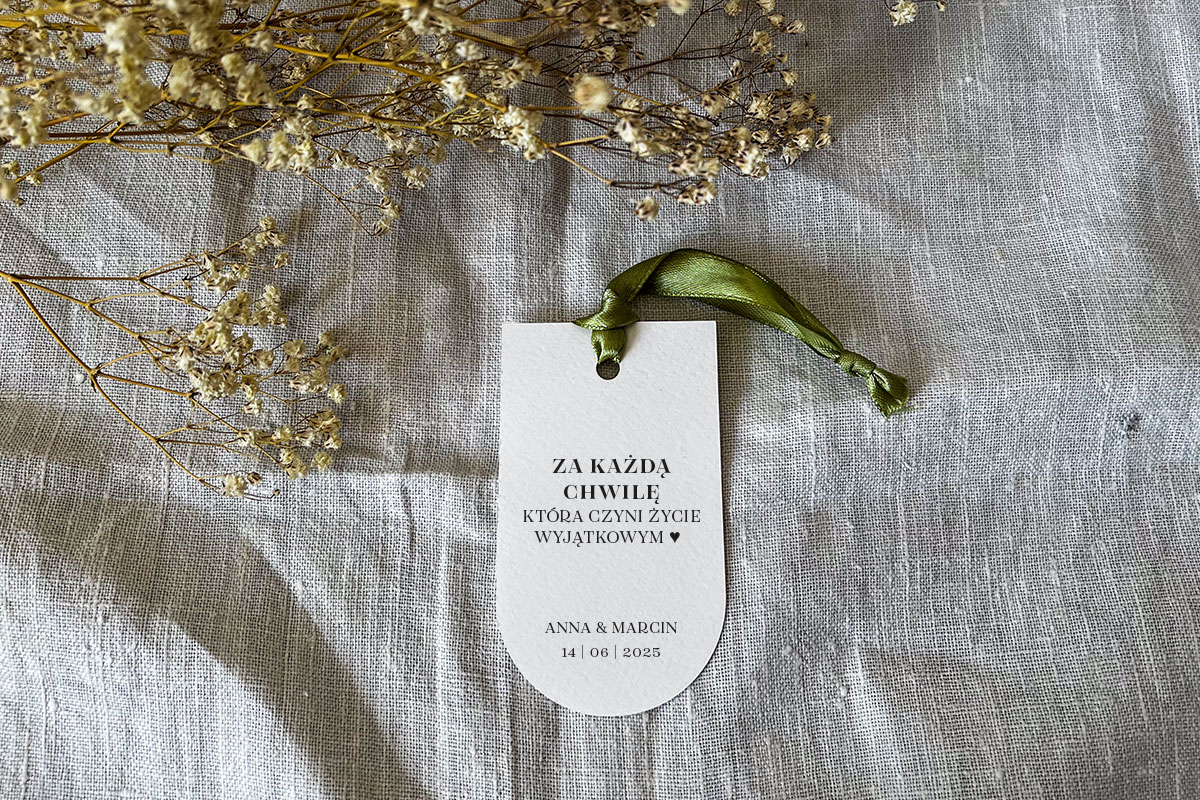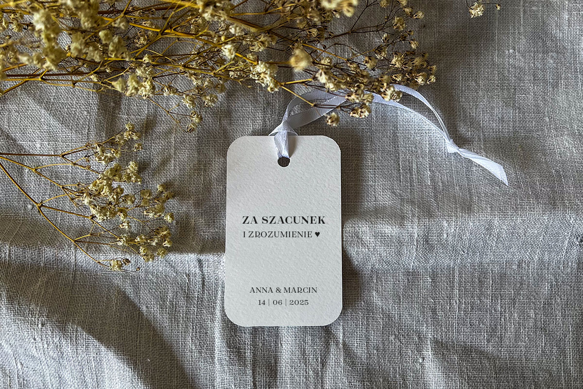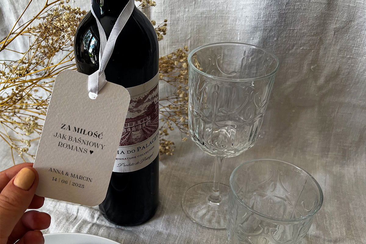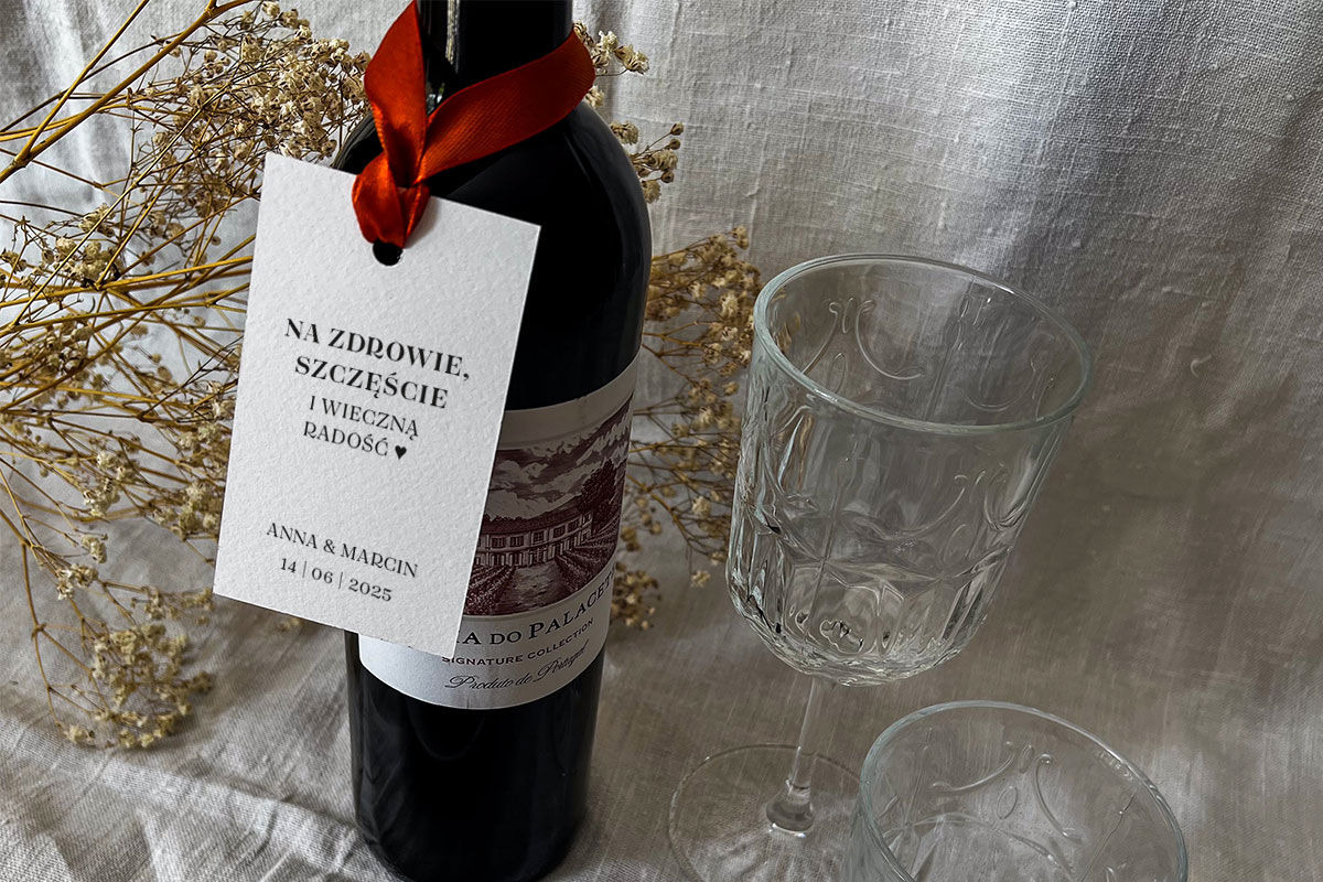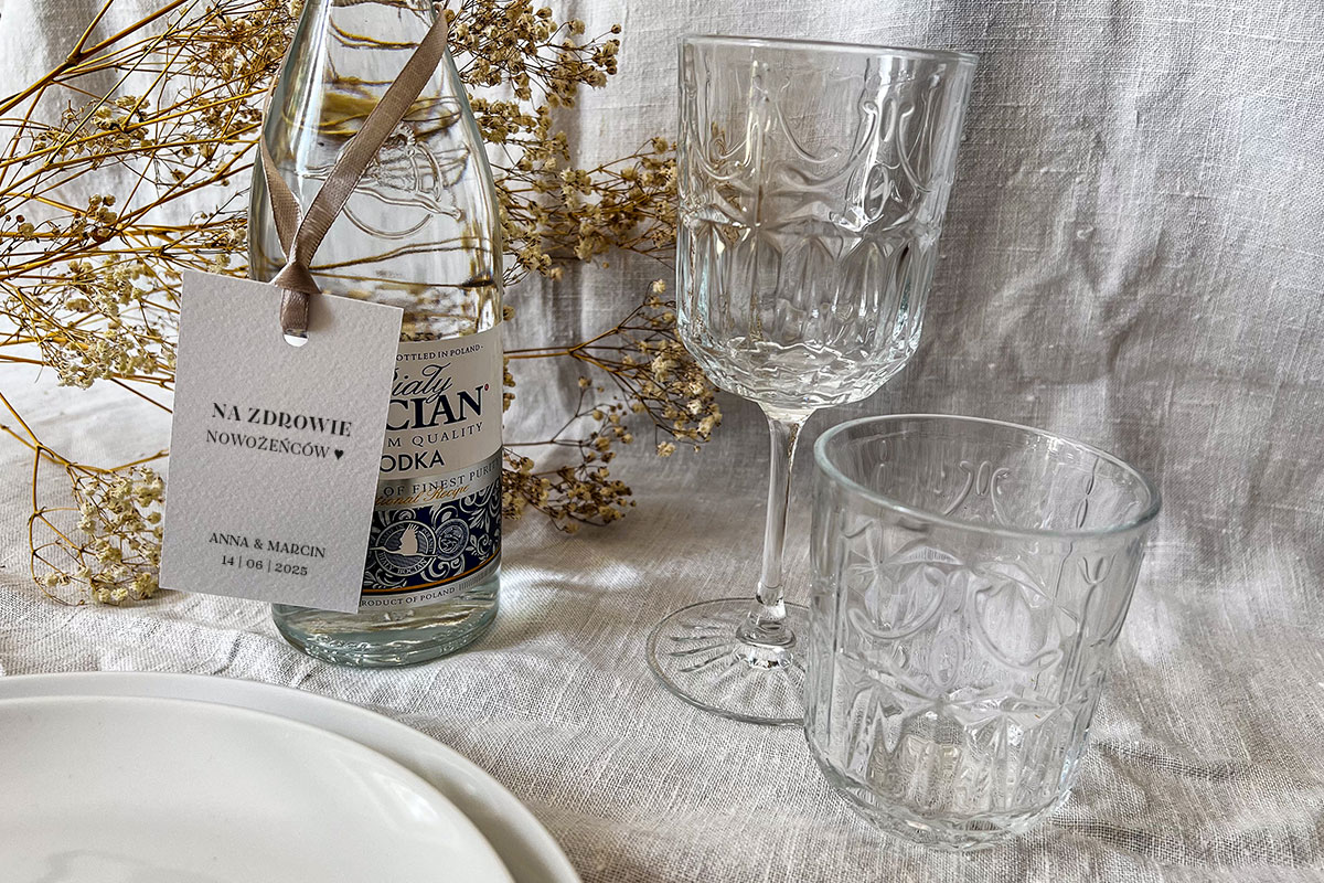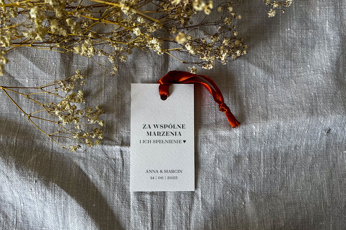 Zawieszki na alkohol o jednostronnie zaokrąglona w wymiarach 5.5 cm x 9.5 cm z otworem + wstążka 12 mm (możliwość wymiany wstążki na taką o szerokości 6 mm, wstążka wliczona w cenę, inne kolory wstążek: https://slubneprojekty.pl/kolory-wstazek/). Wzór graficzny omawiany jest indywidualnie (dopasowany do potrzeb klienta). Wydruk na wysokiej jakości papierze (250 g). Możliwa zmiana koloru papeterii w ramach dostępnych kolorów papieru: https://slubneprojekty.pl/kolory-papieru/.